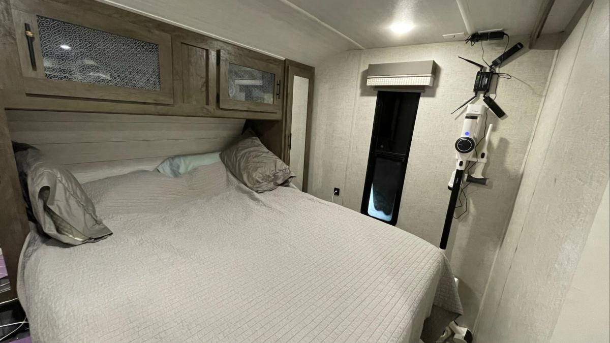 I’ll start with the bedroom. The first thing we did when we got the camper home was take out the mattress that came in it. It was basically a piece of styrofoam about 5 inches thick. I guess it was a mattress in the strictest sense of the word, but to call it that seemed a disservice to actual mattresses. We happened to have a queen sized sleep number bed in our spare bedroom, so we took apart the base for that and moved the mattress and air pump into the camper. I had to drill a couple of holes in the platform for the hoses to go up through, but it actually works out really well. The mirrored doors on each side above the night stands are closets where you can hang shirts and things. Neither one of us are much for hanging shirts up as we both just wear T-Shirts the majority of the time, so we got some plastic drawers from Target and stuck those in there to put our shirts in. The cabinet above serves as our dresser. We do not like having a TV in the bedroom, so we use the TV backer to hang the Wifi router and the Vacuum cleaner.