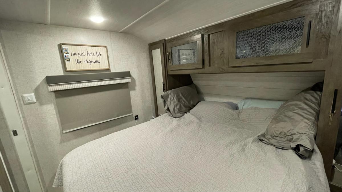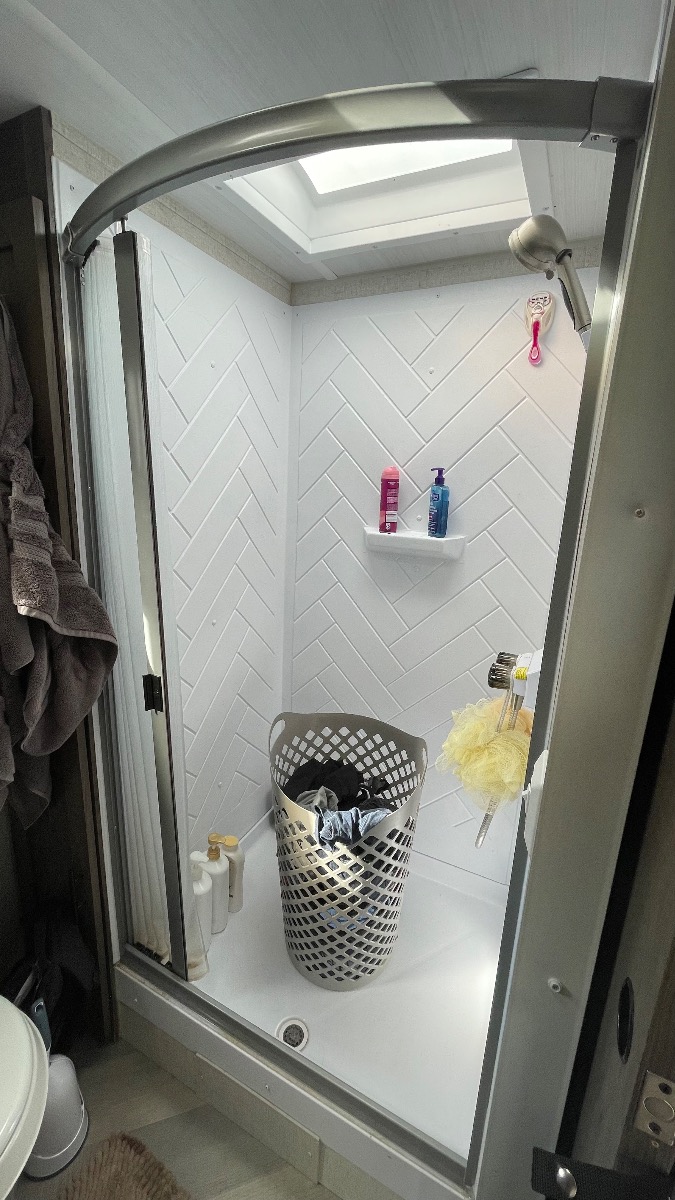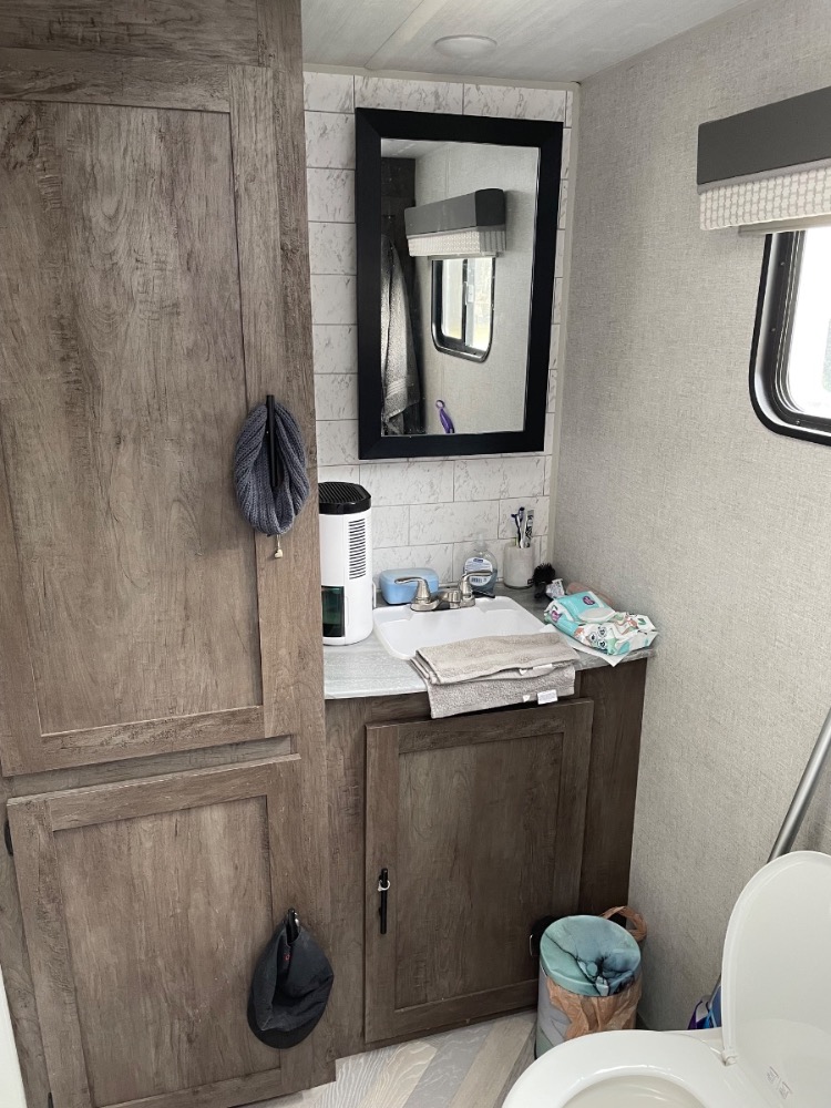 Continuing our trek toward the back of the camper, we arrive at the bathroom. The shower is huge (for camper showers.) In fact, the shower was a fairly big deciding factor in choosing this floor plan. We toured a ton of campers that had showers barely big enough to squeeze into. This one is actually larger than the showers in some of the apartments we’ve lived in. Lol. The camper only has a 6 gallon water heater, so we put in a water saving shower head. We keep reading in Facebook groups about people only being able to take 3 to 5 minute showers. We’ve never had that issue, thankfully. I don’t think we’ve ever ran completely out of hot water.