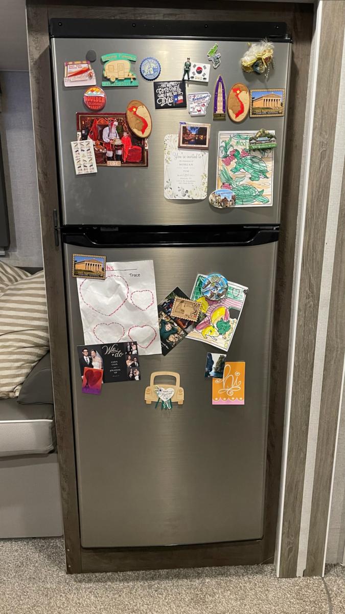 Here, we have the fridge. It’s not quite full size residential, but it’s close. It is big enough to hold about a month’s worth of meat and other necessities after a trip to Sam’s Club or Costco. It is a 12 volt fridge, which means it basically runs on the house batteries. We’re usually plugged in to power, so that keeps the batteries topped off. The nice thing is, since it does run on the house batteries, it keeps the food cold while we’re driving. No need to worry about things spoiling on long drives.