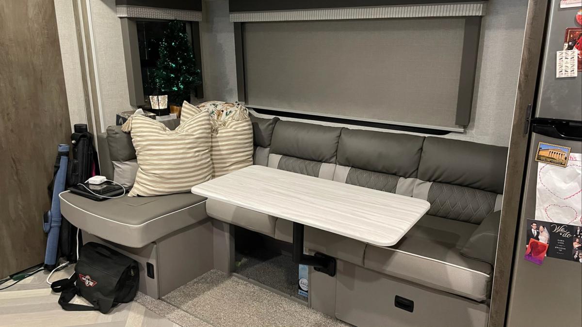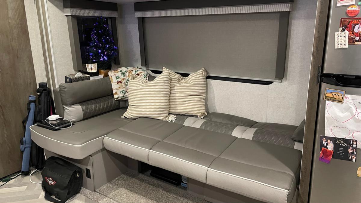 Next, we have the living room/dining room. In its normal configuration, it’s just a couch! A pretty comfy couch, at that. Lots of storage underneath. Storage is at a premium, so every little bit is a blessing.