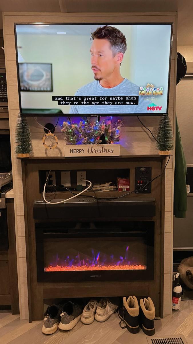 Then we have the TV and electric fireplace. It’s a 42″ TV. Plenty big because we can only sit about 8 feet away from it. The fireplace has no trouble heating the entire camper unless it gets down in the lower 20s. Then the central heat has to lend a hand.