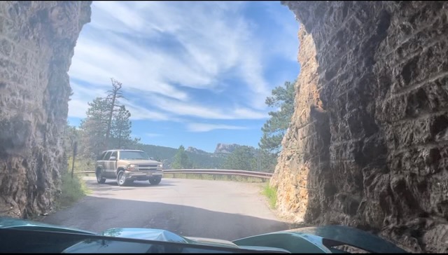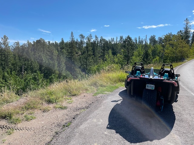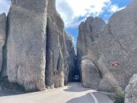 Friday we went to do a few of the scenic drives in the area. One of these was the Needles Highway. Needles Highway is famous for having some extremely narrow tunnels. The narrowest of which is technically wide enough for our truck to fit through, but it would be pretty close. So, we rented a Slingshot for the day. It’s a 3 wheeled vehicle kind of like a Spyder, but has 2 seats and an actual steering wheel. Holy crap was that thing fun to drive!!
