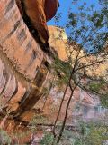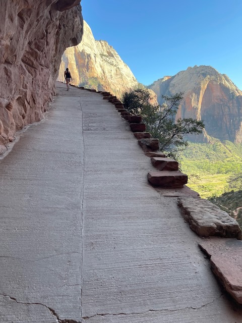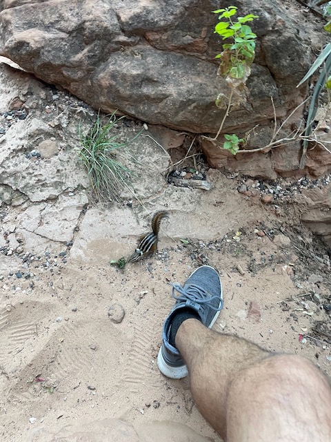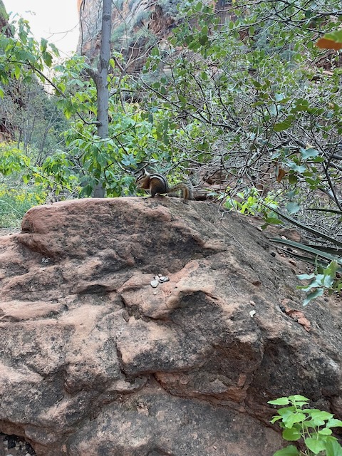 Once we completed that hike we decided to finish the day hiking the west rim trail. As far on the easy scale as riverside walk was, this one was almost as far on the strenuous scale. 4.2 miles round trip and it felt like straight up just about the whole way. We kept trying to get a picture that showed just how steep it was. Not sure if any of them really did. It was also very apparent why the description said long drop offs, not for small children or anyone afraid of heights. At one point we stopped to rest and have a sandwich and a chipmunk came and begged us to share. Sorry buddy. No feeding the critters.